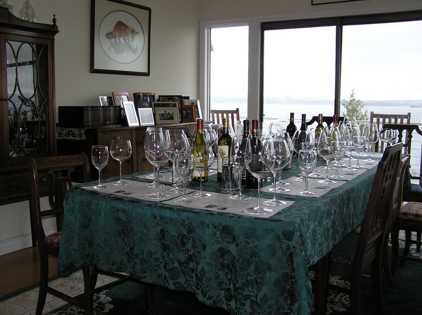 When we have friends over to the house to do a wine and glass tasting we usually try the wines in three types of Riedel Glasses – Vinum Extreme, the Sommeier Series, and the O series. These three series represent a range of prices and illustrate large differences in smell and tastes with the wines. My favorite is the Sommelier series. The photo on the left shows our dining room table set for a tasting with eight people with four of our favorite northwest wines.
