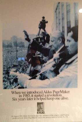 I’ve been fortunate to take those dreams and turn them into successful ventures for the companies I’ve worked for.  Aldus was a set of people who attracted me from the start.  Aldus was a company in which I hoped I could see my life goals come to fruition; where I could combine my mind, body, and spirit to create the next desktop revolution – interactive.  There was a heart in this company that continues to attract people with the spirit and zeal to help change the world for the better.  Doug Stuart, Aldus Engineering Director, first provided a glimpse of the Aldus heart when he pointed to the Yeltsin Poster that was used for advertising during my early interviews (I managed to keep the framed copy when I left Aldus and it hangs in my office).