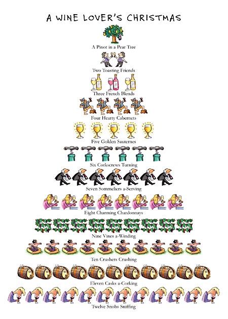 My loving bride gave me a wonderful Christmas gift – Note Cards with the 12 days of Christmas from a wine lover’s perspective: