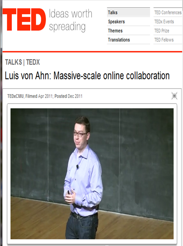 At the core of his research is how to use the value of hundreds of millions of internet users to provide society value a little bit at a time. His most recent exercise is Duolingo for using the process of learning a language to help translate large parts of the web. The question he asked of himself and his grad students was “how can we use the talents of 100 million people to translate the web to every major language for free?”