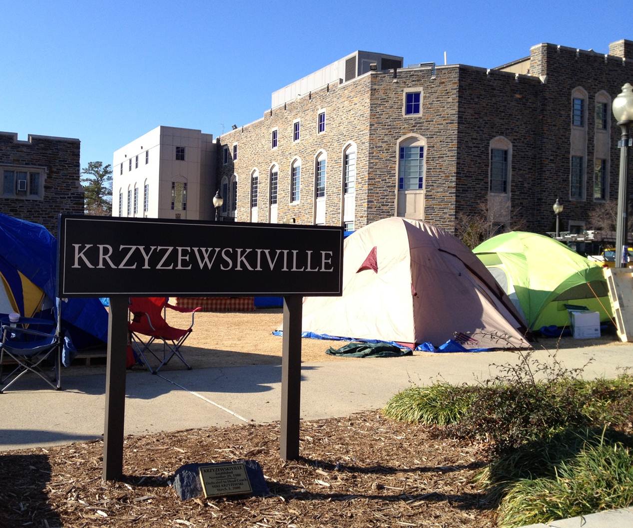 I picked up my nephew, gave him his official Duke basketball shirt (angering my sister in her UNC sweatshirt mightily) and we headed to Durham for the game. When I’d picked up the tickets from Will Call earlier in the day, the agent said that I should get there at 4pm to lineup as the tickets weren’t for reserved seats. As we hurried to the game, I made sure that I took Ross through Krzyzewskiville to see the camping students. We were able to get in line about 5:30pm and we were only 40 fans back. Earlier in the day, Cathy Davidson talked about the amazing K-ville constitution that the students develop and ratify each year. This model of student governance is what led her to have the students develop a constitution in her class.