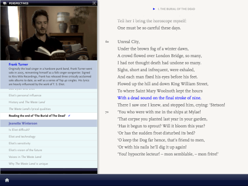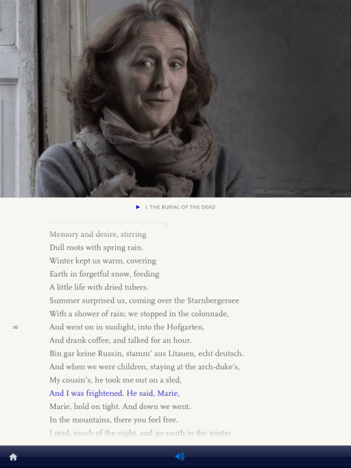 My favorite “digital media” variant within the app is Fiona Shaw performing the poem while the poem’s text is also presented on screen with the current line of the poem she is speaking highlighted in blue.