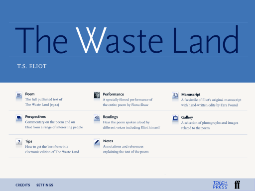 A recent Wall Street Journal article describes this shift in media as “Blowing Up the Book”. One of the adaptations to eBook format mentioned in the article is T.S. Eliot’s “The Wasteland.”  This iPad app “includes a facsimile of the manuscript with edits by Ezra Pound, readings by Eliot recorded in 1933 and 1947 and a video performance of the poem by actress Fiona Shaw.”