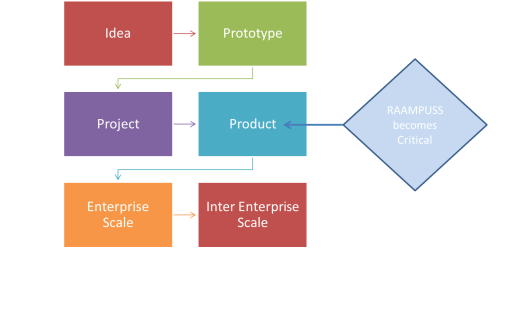 As the volume of the product sales increases and/or the size of customer deals increases, RAAMPUSS becomes more important to the organization than incremental functionality because the product becomes mission critical for the customers. The diagram below looks at the natural progression of a product from initial idea to something that is used between several enterprise scale corporations. During the first three stages, the importance of functionality and will the idea work in a real world setting overwhelm the need for high quality. But once an idea has proven itself in a pilot project, most customers want to leap to enterprise scale deployment.