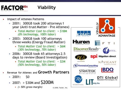 What you saw this afternoon represents a very small portion of what we are crafting for a suite of innovations and products. In much the same way that Mitch Kapor saw that Visicalc needed graphics and text (Lotus 1-2-3) in order to become an order of magnitude larger business and then Microsoft trumped their efforts by combining Excel with Word and Powerpoint to create an even larger business, I believe that between Preston Gates and Attenex we can articulate and build our equivalent of Microsoft Office. We will not get stuck like the Visicalc folks in thinking that their innovation would last forever as a viable business.