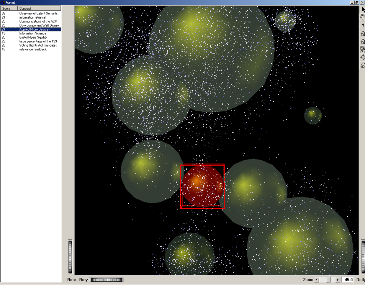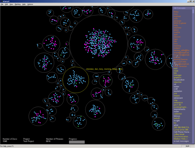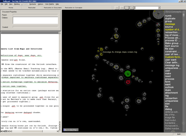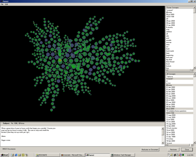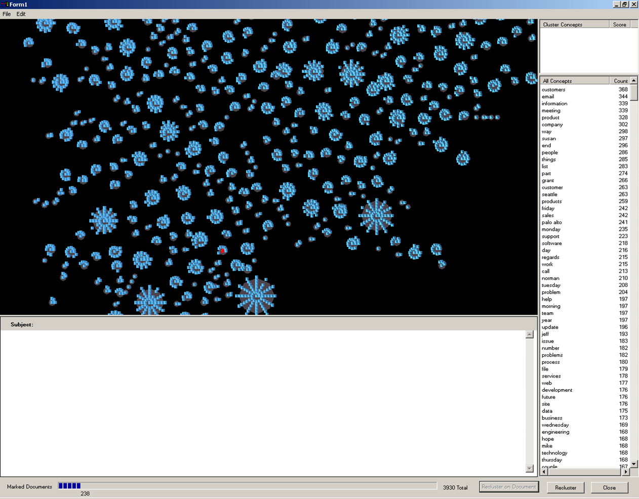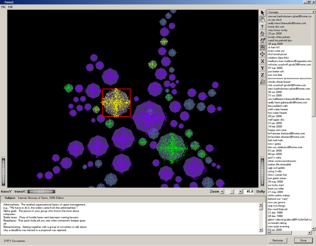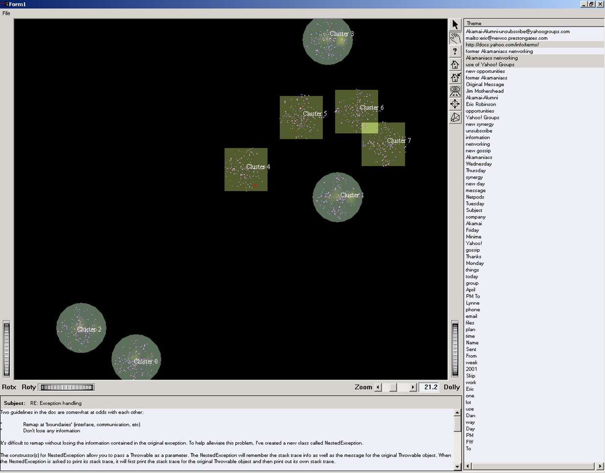 Now that we had some document processing going on, we could exploit different panes within the 3D interface to show different types of clusters in the overall document space along with a concept pane on the right and a mail message viewing pane on the bottom. The core components of the user interface were starting to show up.