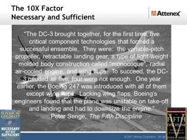 “The DC-3 brought together, for the first time, five critical component technologies that formed a successful ensemble. They were: the variable-pitch propeller, retractable landing gear, a type of light-weight molded body construction called “monocoque”, radial air-cooled engine, and wing flaps. To succeed, the DC-3 needed all five; four were not enough. One year earlier, the Boeing 247 was introduced with all of them except wing flaps. Lacking wing flaps, Boeing’s engineers found that the plane was unstable on take-off and landing and had to downsize the engine.”