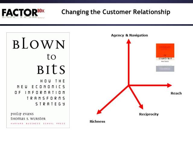The interaction and terms that Kevin used reminded of Evans and Wurster’s book Blown to Bits: How the New Economics of Information Transforms Strategy. I really liked their dimensions of Reach, Richness and Reciprocity. To these terms I added the notions of Agency and Navigation from The Cluetrain Manifesto.