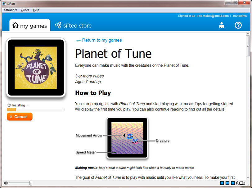 The business model for Sifteo is clear – the games store. At least you have some point credits when you get started so you don’t have to spend real money to get a game to get a sense of what the cubes can do.