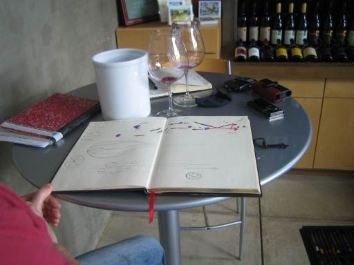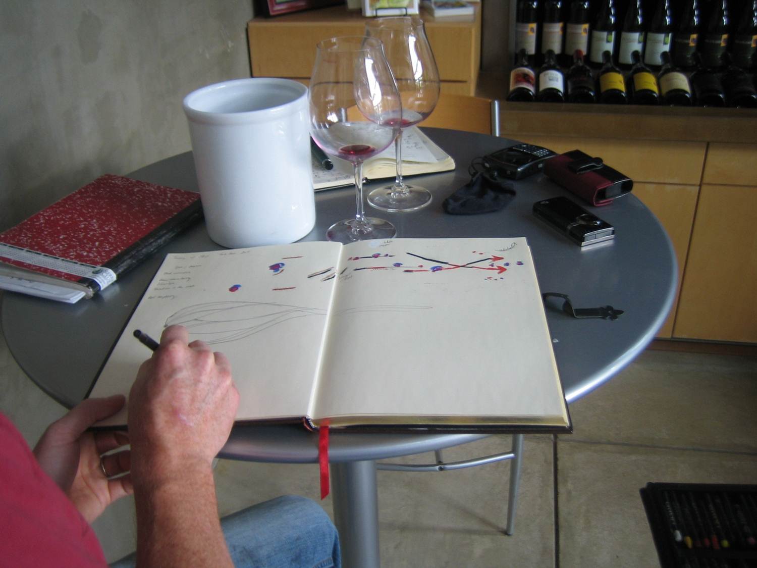 At the time of the shape tasting observation, Dominio IV was still located in the Carlton Winemakers Studio. We took over a table in the tasting room and Patrick brought out a Tempranillo that he was in the process of figuring out a final blend. We both tasted the wine and made some initial comments on how we thought the wine was maturing. Patrick then brought out his sketch book and I was overjoyed to find that he had a rich palette of shapes and colors to create his image of his wine tasting palate.