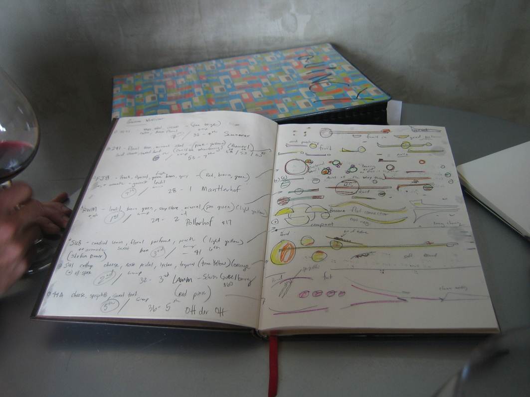Like all good conversations with a winemaker, sooner or later you end up in the barrel room to demonstrate what you’ve been talking about with a taste of wine. I had a great time tasting through different vineyards and watching Anna sketch the shape of the wine against her palate. The joy for me is that several terms that wine writers use all the time finally became clear like “fruit forward” or “long drawn out finish.” By first sketching the shape of one’s mouth opening and then using symbols to represent types of flavor profiles and where they occur on the palate, I could see the taste of the wine.