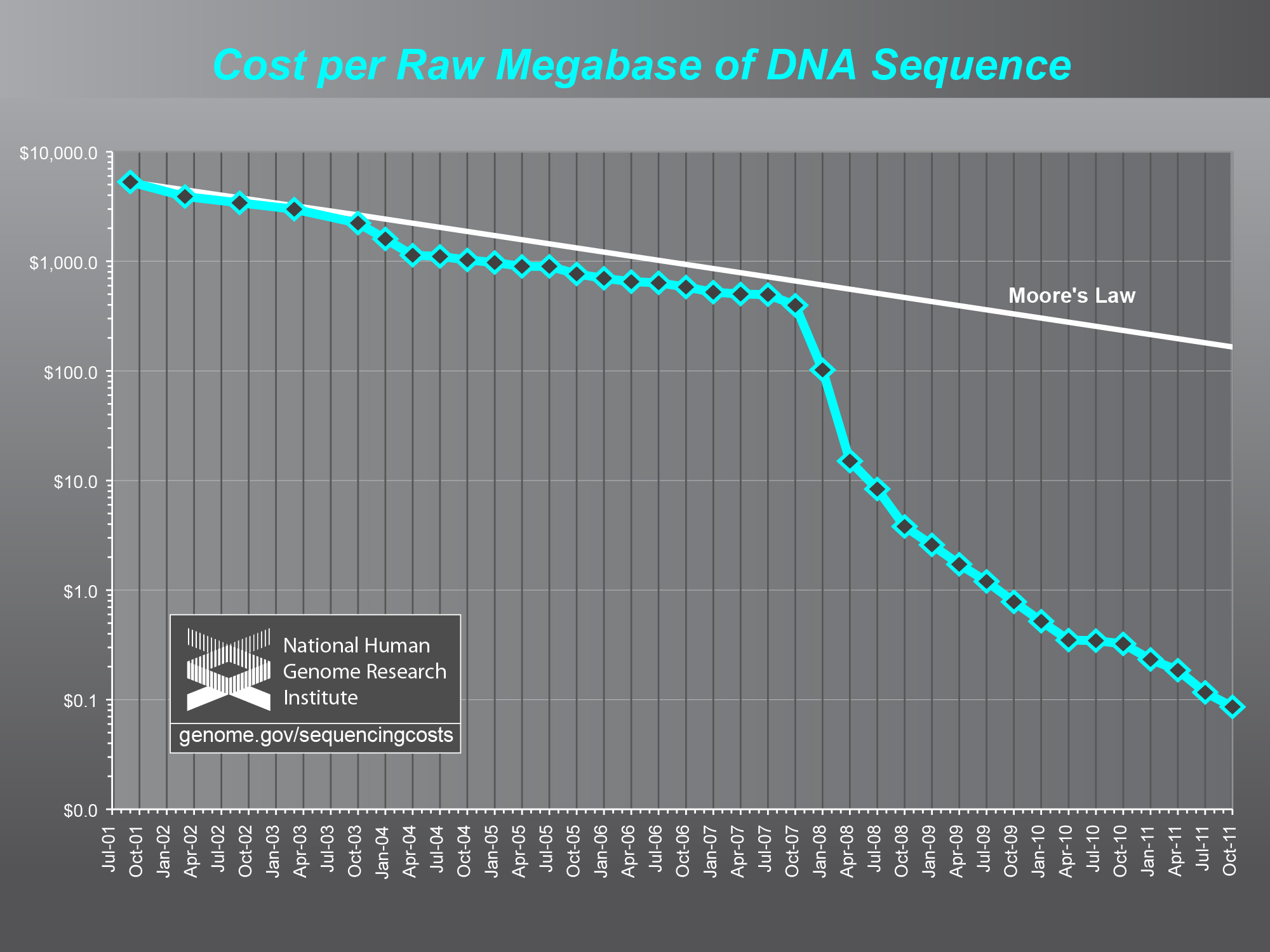 As a UW bioethicist, Malia Fullerton introduced us to many of the issues surrounding the research charge into personalized medicine. She focused her presentation on the implications and ethical challenges of whole genome sequencing. I was staggered by the rapid rate in the decrease of the costs to sequence a genome. By the end of 2012, the cost for my whole genome sequence should be $100. She showed the following slide comparing the cost per megabase to Moore’s Law: