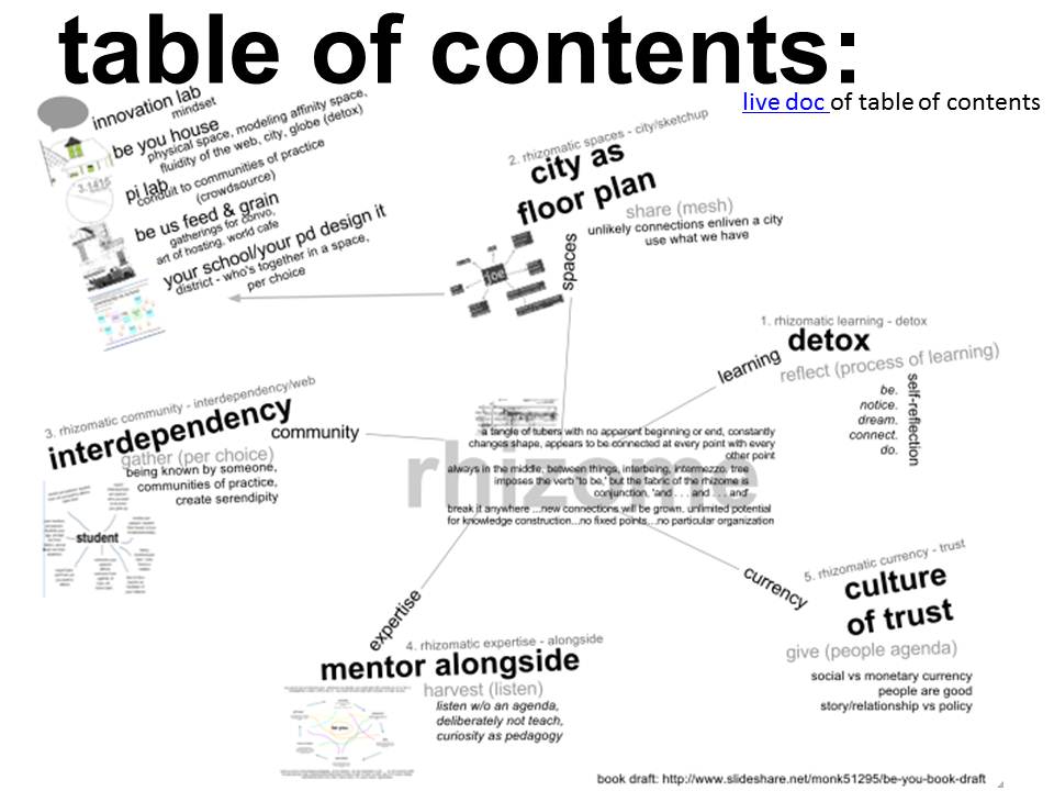 The Be You authors using tools that exist all around us (Powerpoint, Google Docs, YouTube) provide a very compelling story of the journey to Being You. Much like trying to skim through Chris Alexander’s Timeless Way of Building, I kept getting stopped by wonderful FORM and CONTENT. Each time I scan through Timeless, I have to stop and read the section about the simple Japanese fish pond: