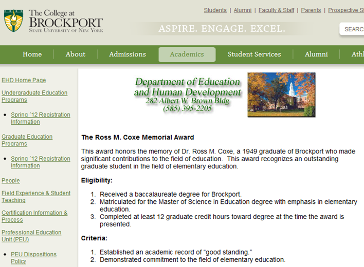 So I did a search for his name to see if any of his articles or other history were available on the net.  Up came an entry at The College at Brockport State University of New York for the Ross M. Coxe Memorial Award. I had completely forgotten about this memorial that my cousin, Kathy D’Ambra, had helped set up. I then emailed the library at Brockport State to see if they had his dissertation on record. They kindly called this morning at 6am Seattle time to share that they couldn’t find anything. Now that was responsive customer service.