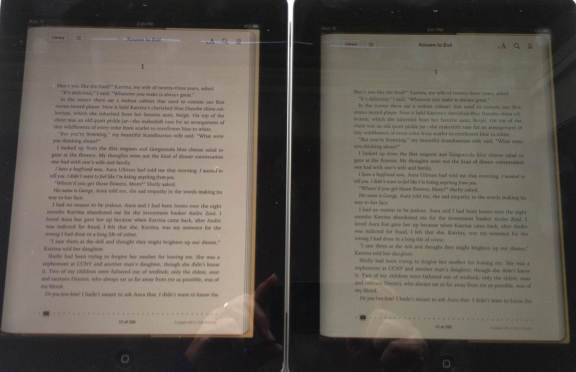 Even with the photo taken with an iPhone 4s, you can see the crisper characters of the iPad 3 on the right. In real life you can see how much blockier the pixels are on the iPad 2. Hopefully, the greater resolution will be easier on my eyes with all the reading I do.
