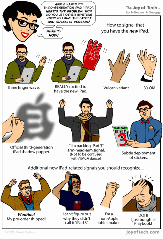 Technology envy is a dangerous thing. My iPad 3 (sorry Apple, I have to distinguish it somehow from the previous two iPads that I have) arrived this morning. It seems I am not the only one that is having a problem making sure other folks know that I am one of the first kids on the block to have an iPad 3.  From Joy of Tech: