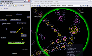 After 300 prototype iterations, we released V5 of Attenex Patterns.  Each dot represents a separate document in the right hand semantic network window.  On the left hand pane we have the organization side of the email address in a social network view for the same set of emails.  An email address provides both the identity of the individual and their linkage to their organization.  Both types of social networks are available for viewing.  Each of the two window panes has referential integrity.  In this case, I’ve clicked on the linkages between Preston.com and Yahoo.com (the yellow arcs in the left pane).  In the right hand pane, all of the emails that were exchanged between Preston and Yahoo are highlighted in yellow.  As I roll over each cluster of documents I can see the topics and subject lines of those email addresses to quickly see what the communications were about.  In this case the discussions were around Acme Construction.