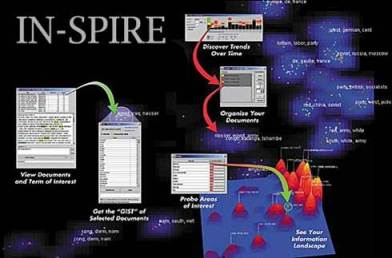 In parallel with our user research and observation, we looked at what technology alternatives might already exist.  We came across the IN-SPIRE project at Battelle Labs funded by the U.S. Intelligence Community.  These tools and projects provided early clues that visual analytics (content analytics + visualization) could improve productivity by at least 2-3 times.