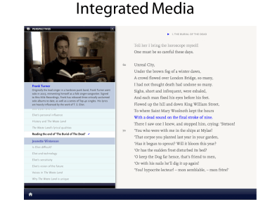 Perhaps the closest example I’ve seen to what Steve Jobs was hoping would happen on the iPad is the implementation of T.S. Eliot’s Wasteland for the iPad.  This image shows a contemporary poet reading the poem with the written text simultaneously highlighted on the right.  Or you can continue listening and jump to one of several Eliot experts critique the poem.