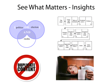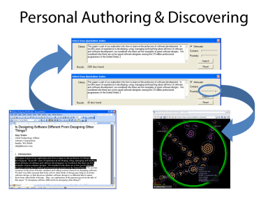 Near the end of my time at Attenex, we had the bright idea to combine authoring and discovering in a single tool.  We started by creating a single user version of Patterns.  We demoed to anyone who would sit still.  They expressed only mild interest.  It wasn’t until we went back to observing users trying to combine authoring and discovering that we hit on a key insight – authors wanted to use whole blocks of text or an entire document to search their archives, not simple keywords – because they weren’t really sure what they were looking for.