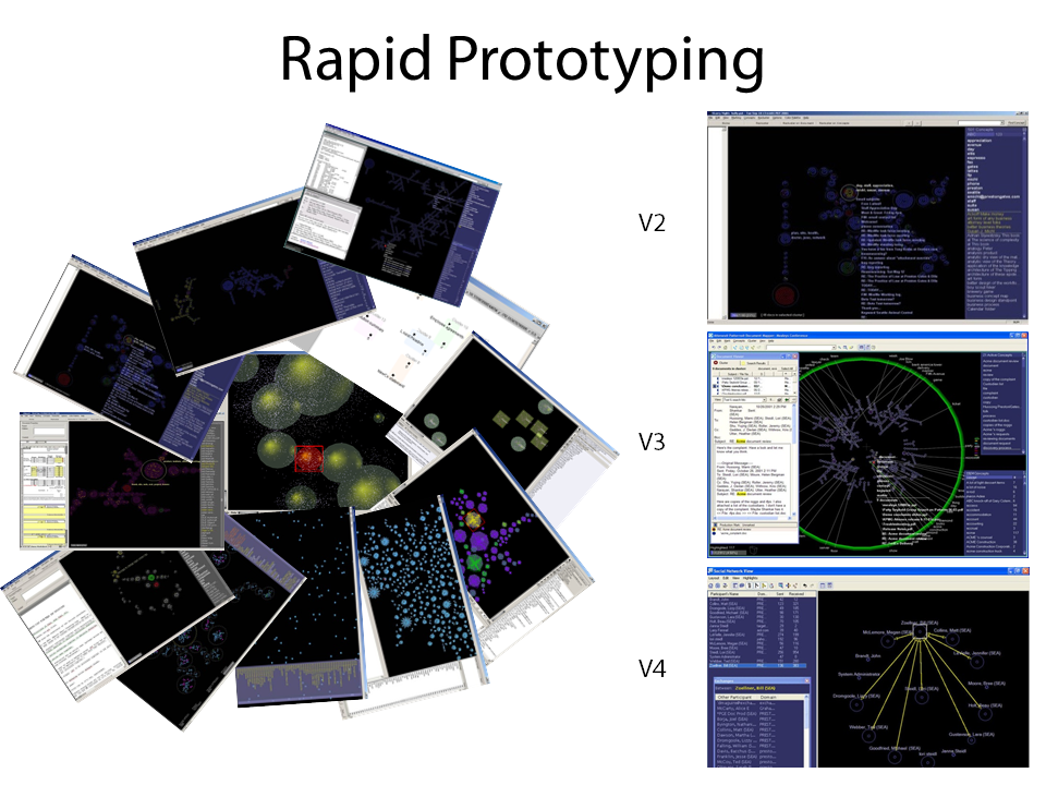 The real problem for us was that we could find no research on first principles for the visualization component.  Prototyping of the visualizations was pure art.  Our designers would conceive of ways to organize the clustered documents and then we’d test the visual art with our lawyer users.  We looked at every published paper and book on information visualization for inspiration.