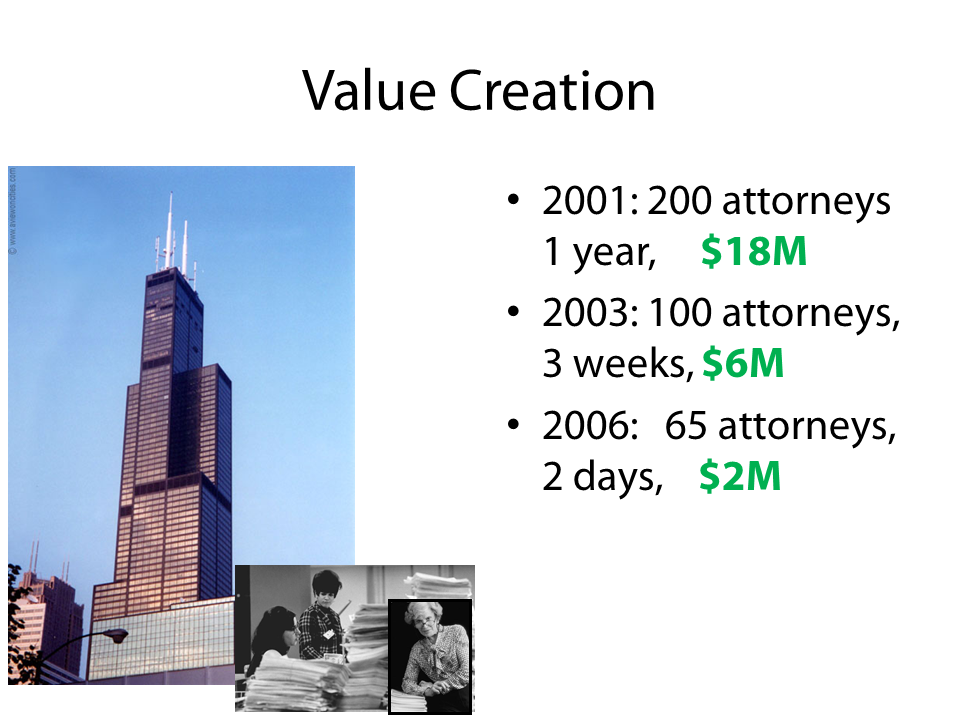 The Microsoft General Counsel came to their law firm, Preston Gates and Ellis (yes, that is Bill Gates’ fathers law firm), and asked (well, demanded) that they figure out how to dramatically reduce their expenses.  The GC did not like the trends that he was seeing in both the number of lawsuits and the amount of information Microsoft was being asked to produce for each separate lawsuit.
