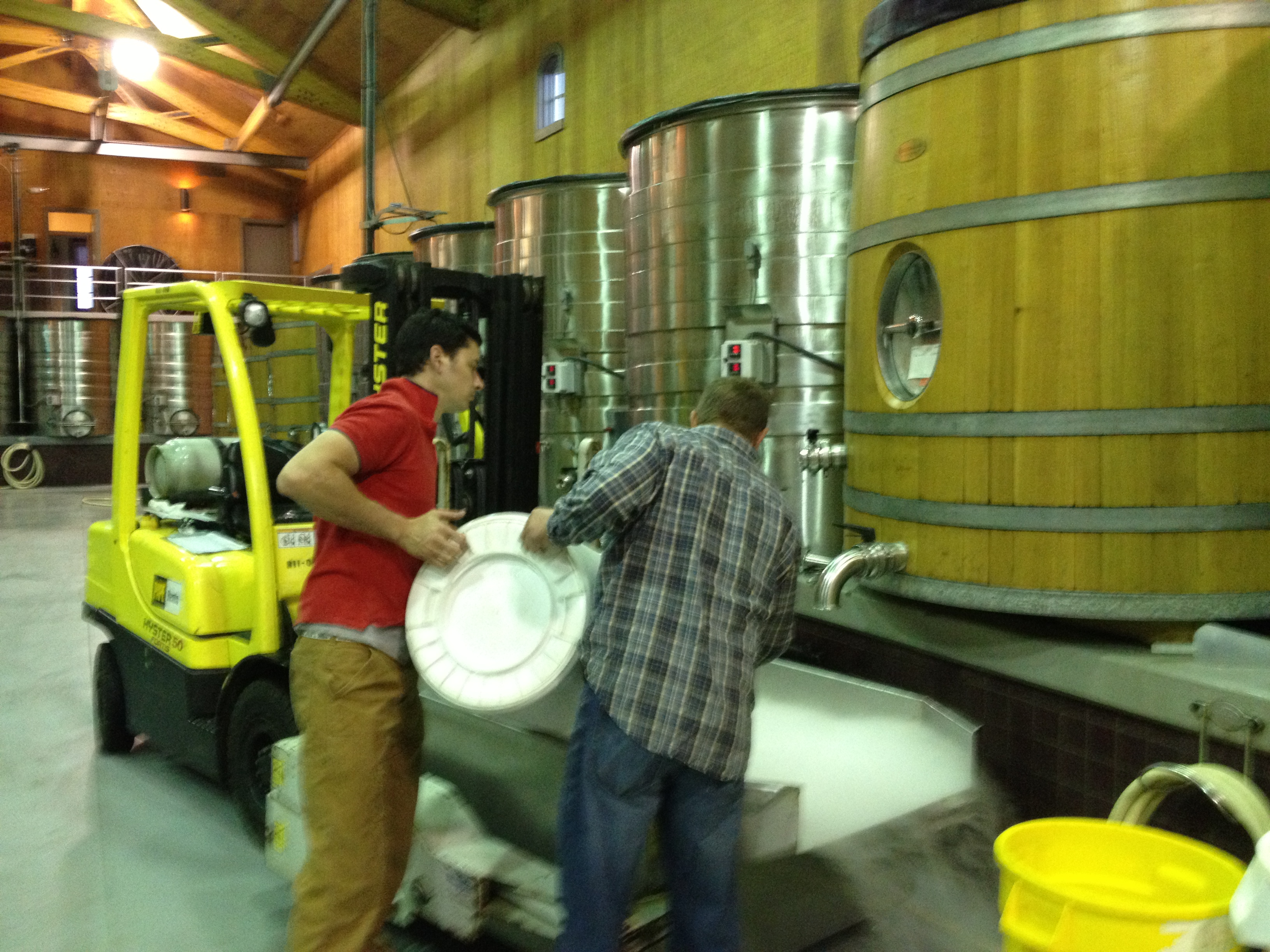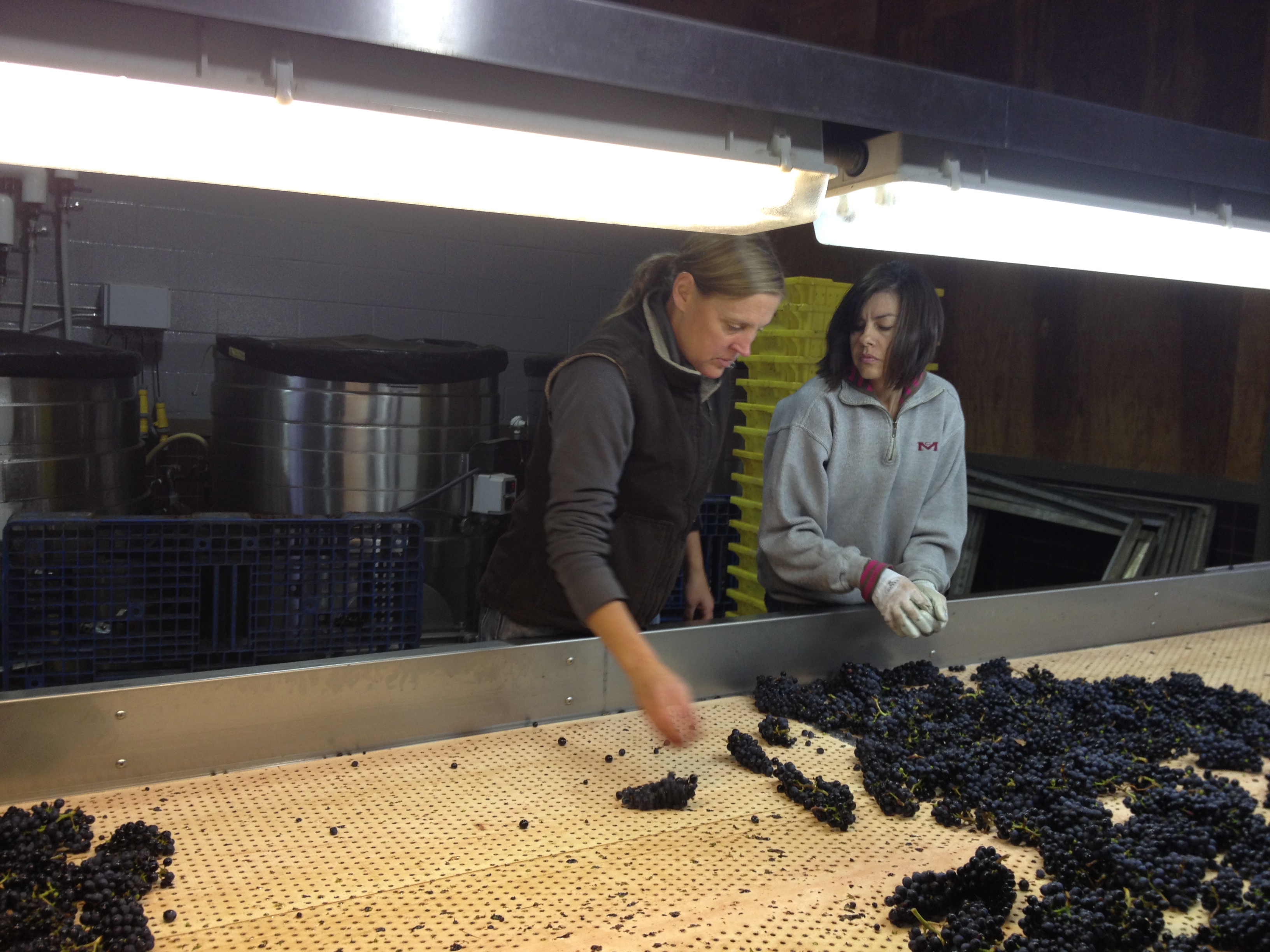 Anna Matzinger (on the left) who is a most gifted wine maker was showing us how to sort the pinot noir grapes before they went to the de-stemmer. There is something wonderfully fulfilling about spending a day on the sorting table contributing just a little bit to the 2012 grape harvest.