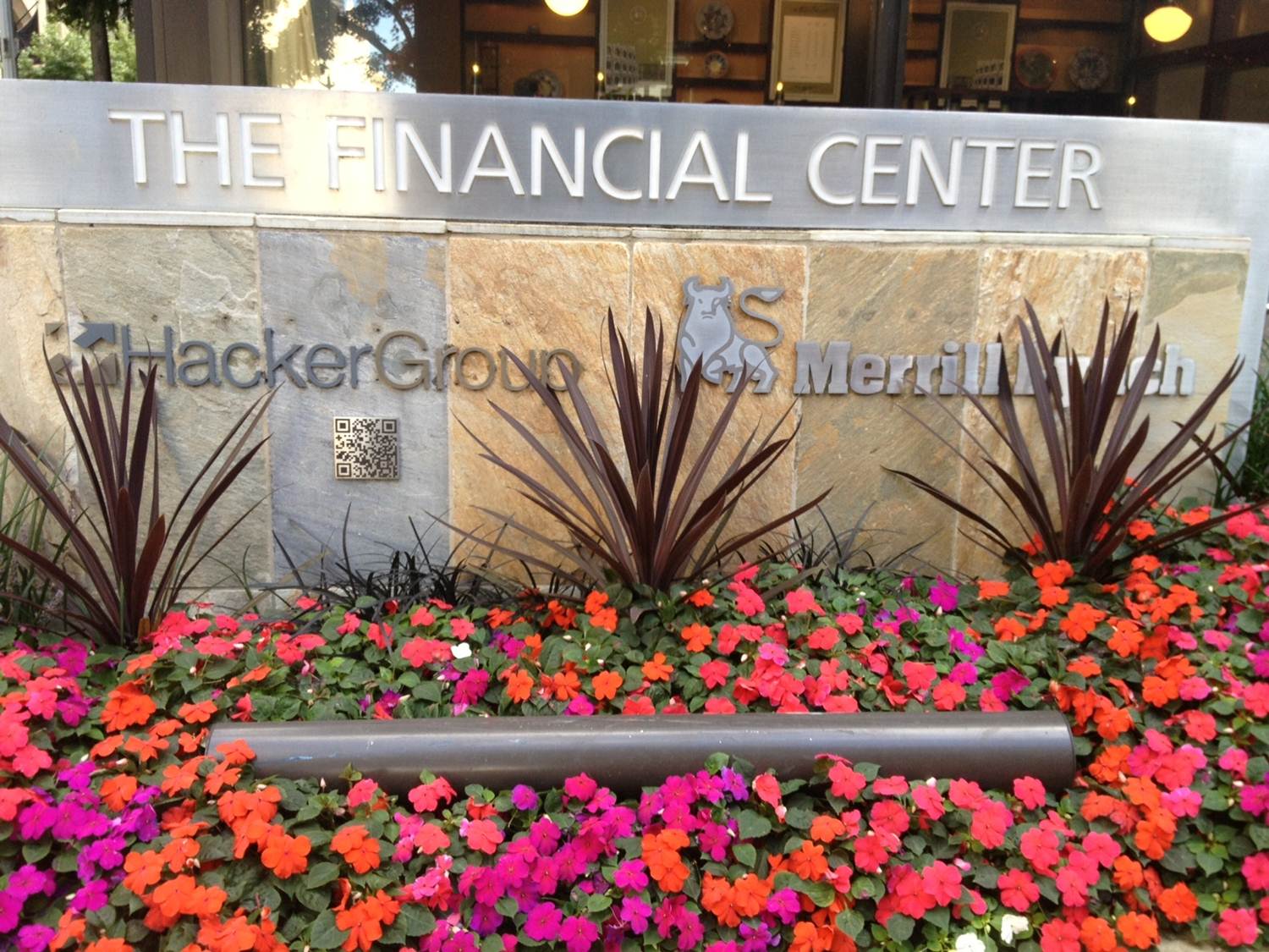 While walking on Fourth Avenue in Seattle on a bright autumn day (a route I walk quiet often), an array of multi-colored flowers caught my eye.  I admired their beauty on this sunny day and kept on walking.  About 20 feet later, the sign registered in my slowly reacting mind.  So I retraced my steps and just burst out laughing at the juxtaposition of the company names on the Financial Center’s branding display.