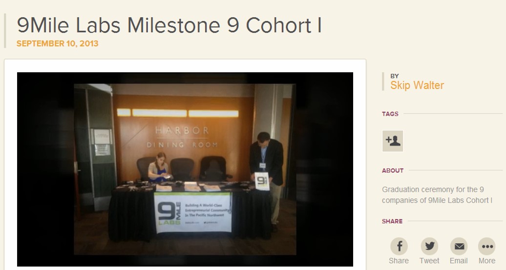 Thanks to the 9Mile Labs partners (Tom Casey, Kevin Croy, Enrique Godreau III, Sanjay Puri, and Sandy Sharma) for their continuing contribution to the Seattle Startup ecosystem.