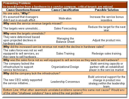 “At the heart of this simple tool is the belief that real problem solving occurs when the cause, rather than the symptom, of the problem is addressed. This is often referred to as ‘drilling down’ to the heart of the problem. Dr. Kano refers to this ‘drilling down’ as ‘going an inch wide and a mile deep into a problem’ (real understanding leading to targeted solutions) rather than ‘going a mile wide and an inch deep into a problem’ (superficial understanding leading to shotgun solutions). At a more philosophical level, the 5 Why’s also demonstrate Dr. Deming’s principle that the real problem usually lies in the deeper system rather than in the performance of an individual who is working within that system.”