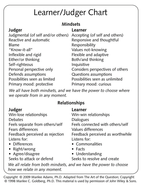 I took a quick look at the two free books and realized the Adams book was in Socratic story form. It won. For the next three hours, I was into the land of Ben (the desperate executive) and Joseph, Ben’s new transformational guru. Joseph described the two constant choices of daily life as being in “learner mindset” or “judger mindset.”