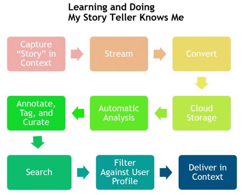 This hypothetical platform is a combination of a rich media mobile device (phone or tablet) for voice, video and text access from the user tied to cloud services for storage, meaning making, and social sharing. Like the many lifelogging apps, Q&A apps (Qazzow) and search engine profiles, the system is highly context aware of the learner/doer. The learner/doer is either in a capture mode (sharing their story or doing activity in multiple media) or learning mode (need help or desire insights or dive deeper). By crowd sourcing the content (capture), we remove a major bottleneck of MOOCs and other online learning systems. Through a Wikipedia-like editing team and automated curating analytical engines, the best and most appropriate content in context is available for the learning mode (help, insights, deep dive).
