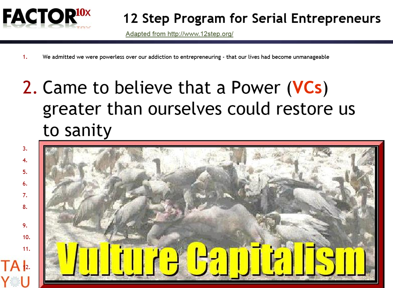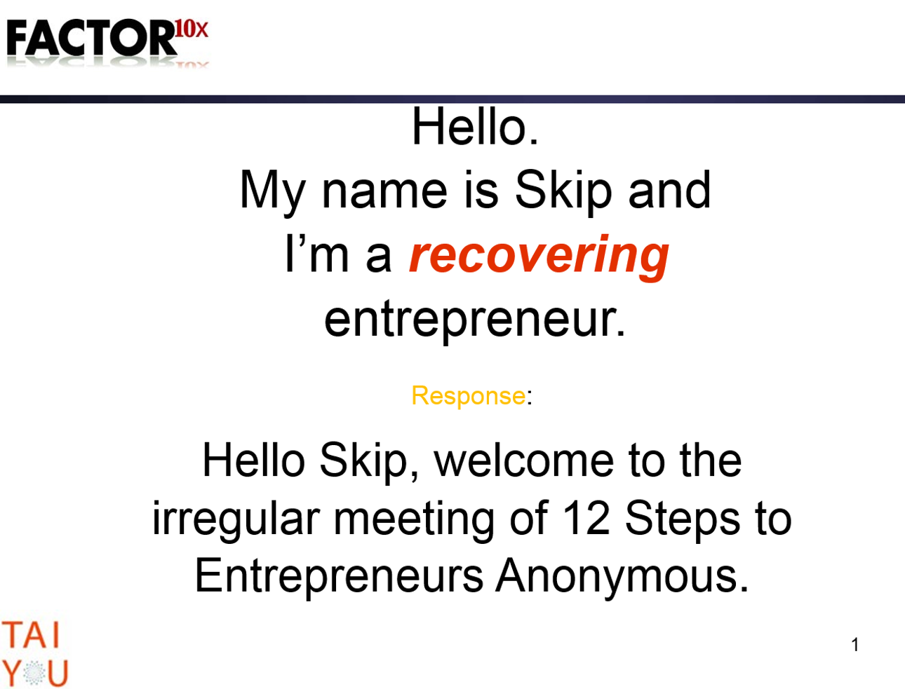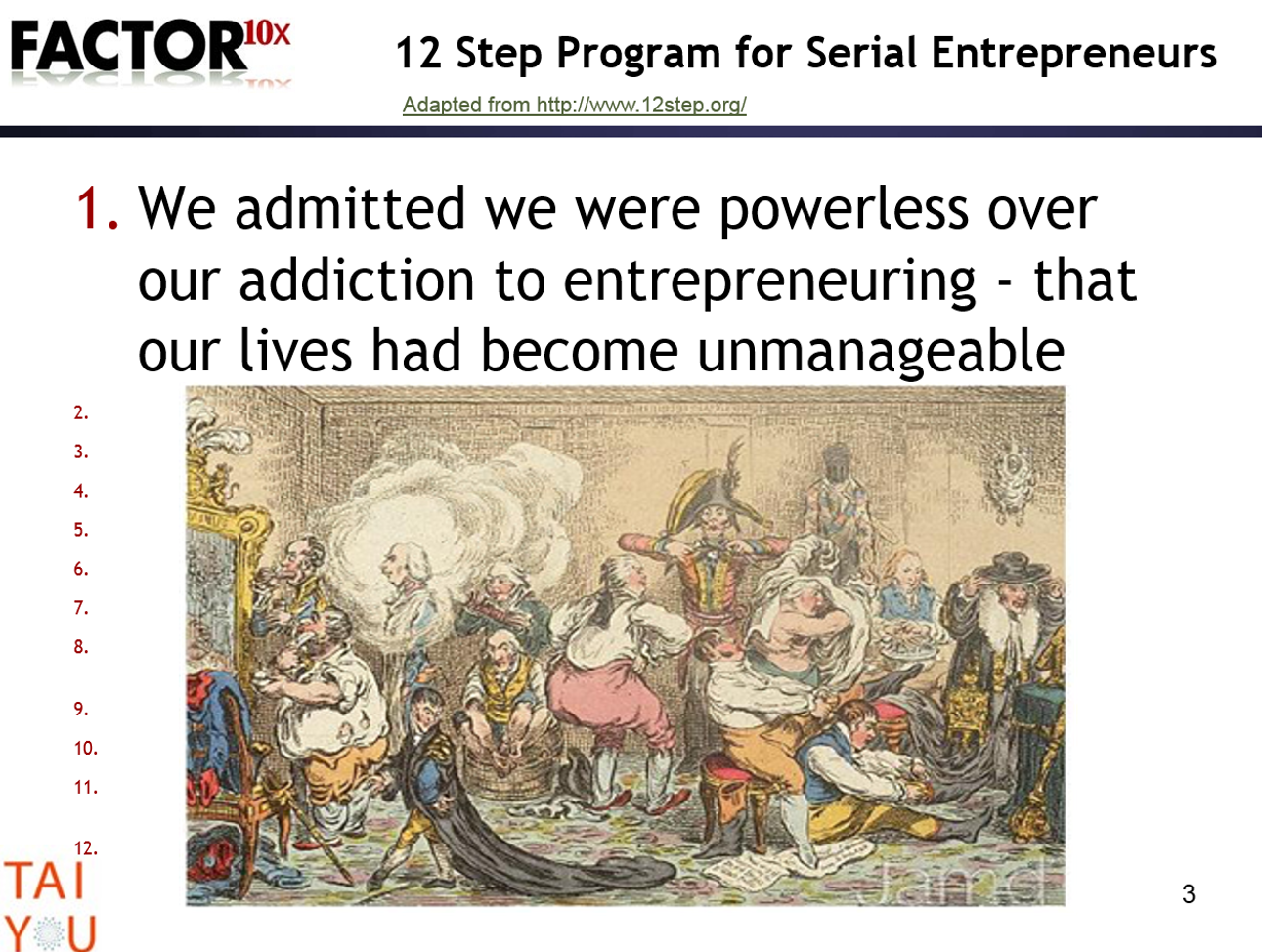 With deepest respect to the 12 Step program for recovery, which has meant so much to family members, friends and colleagues in their daily struggle in recovery, I draw from the program to poke a little fun at those of us who can’t resist our addiction to entrepreneuring.