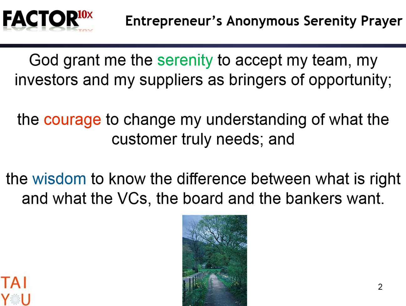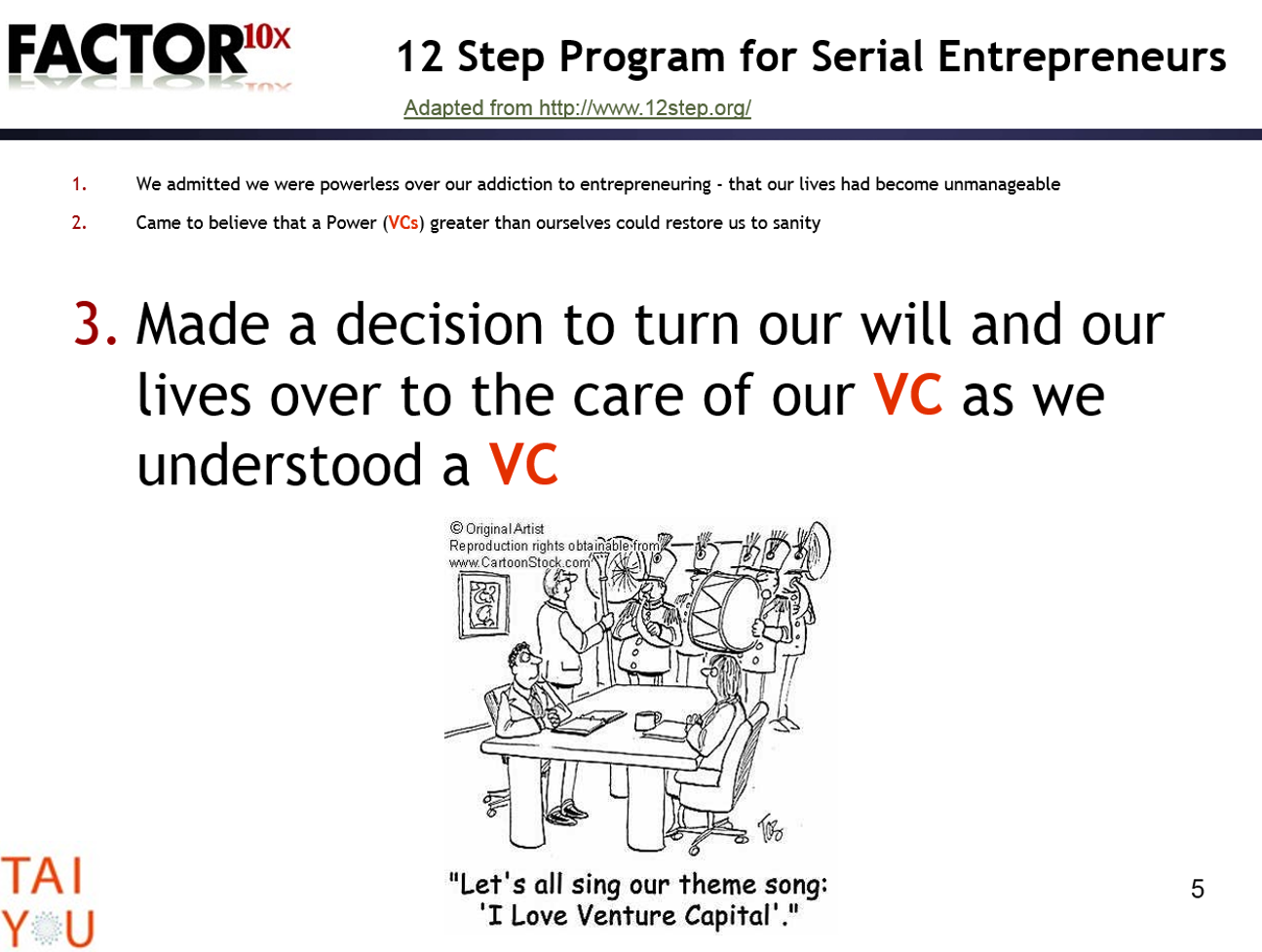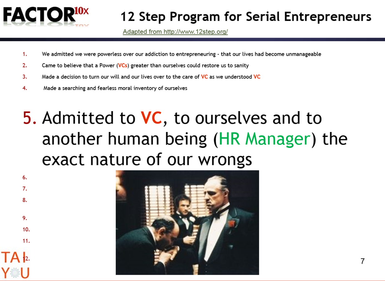 With deepest respect to the 12 Step program for recovery, which has meant so much to family members, friends and colleagues in their daily struggle in recovery, I draw from the program to poke a little fun at those of us who can’t resist our addiction to entrepreneuring.