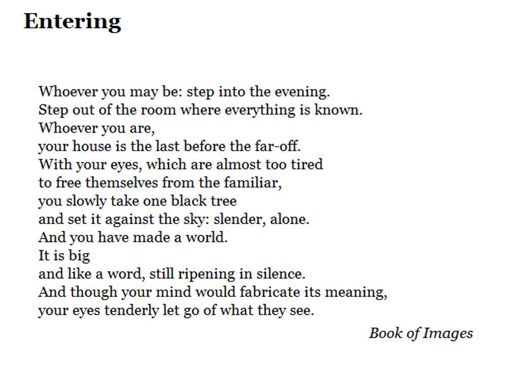 Barrows, Anita; Macy, Joanna (2009-10-29). A Year with Rilke: Daily Readings from the Best of Rainer Maria Rilke (p. 3). HarperCollins. Kindle Edition.