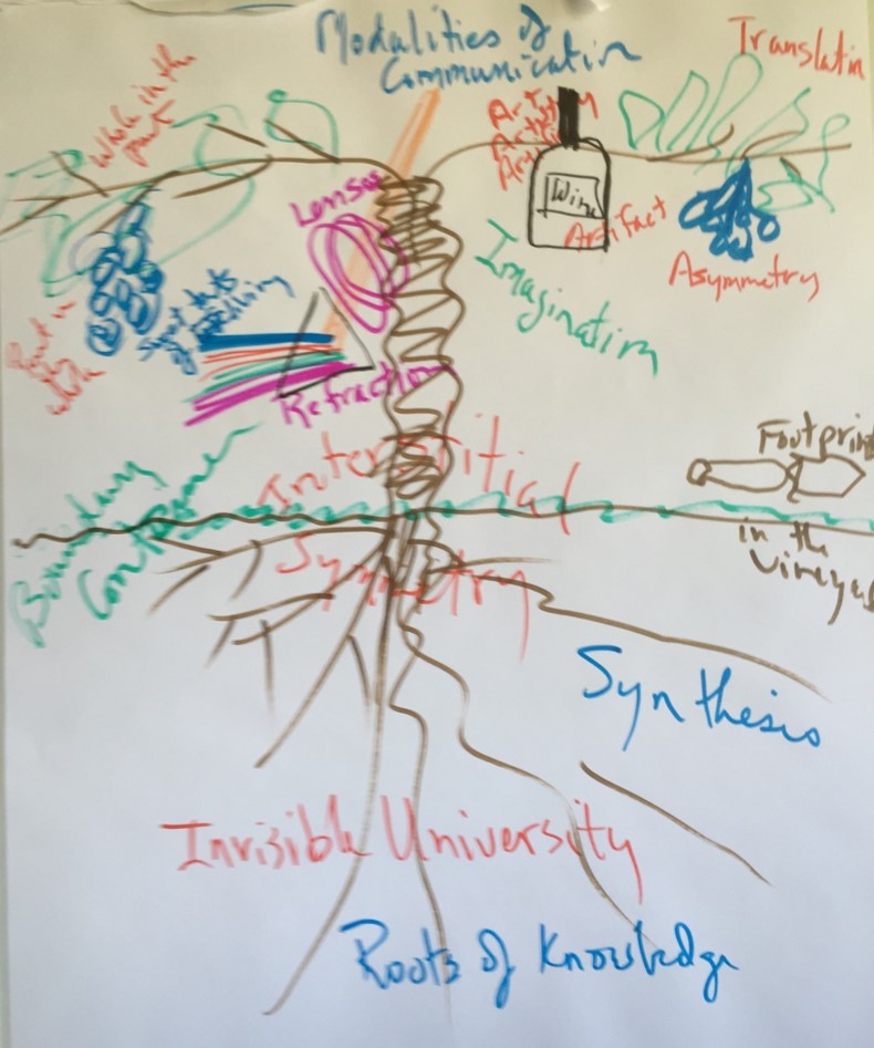 “I mean mediating in the sense of McLuhan‘s ‘the medium is the message’. In order to think about something more deeply, I need to get it out of my head so I can see it. Once I see it, it comes back into my head a different way. When I really need to think through something (seeing), I have to stand at a white board or a flip chart (moving) and draw objects (flowing) and their relationships (flowering). Kind of like I did with my ‘vine root’ process (mediating),” I explained.