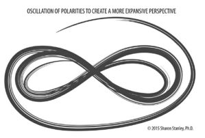 “Oscillating attention between the polarities of “forgotten” experience and sources of vitality differentiates neural states that may be fused, then allows them to link as new neural connections. Oscillation can be expressed visually with the infinity symbol, the figure 8 on its side. See Figure 8.1. Differentiations of phenomena reveal the opposites contained within an experience, and linkage brings the opposites into a more expansive form, leading to perspectives that integrate polarities.”
