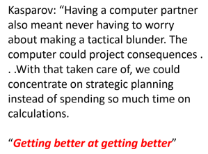 Two months ago, my colleague, Scott Parris, said “you know I think it is time we go back and find out about Gary Kasparov and what has happened to him since he lost to that computer thing, Deep Blue.”  It turns out Kasparov has been running competitions of the old way with grand masters against grand masters, and new ways with grand masters against computers, and humans and computers working together against technology or other humans.  They found out it was the combination of humans and technology and great process that were the winning teams.