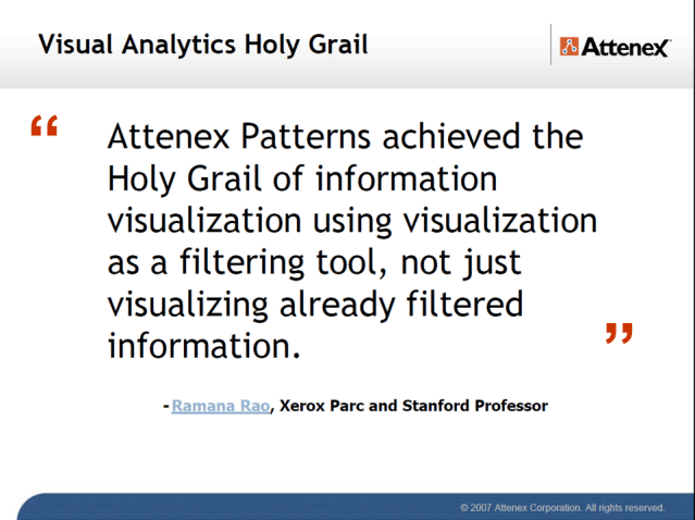 • A successful visual analytics product should strive for the Holy Grail of information visualization as described by Ramana Rao – “using visualization as a filtering tool, not just visualizing already filtered information.”