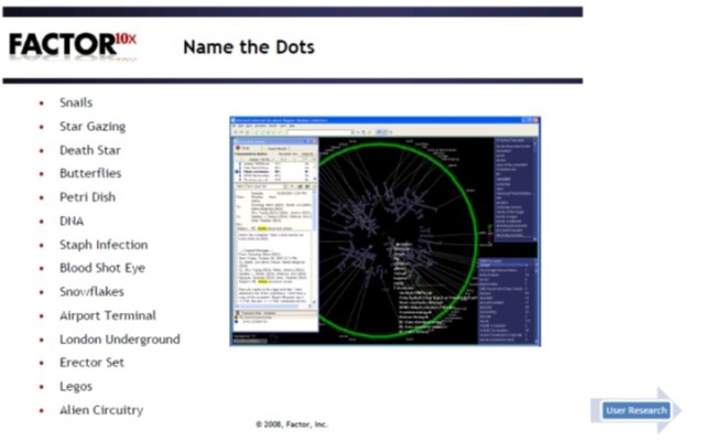 As mentioned in “Attenex Patterns History – The Critical First Year,” we were inspired by the work of Jim Thomas and the visual analytics researchers at PNNL.  They showed us that the principles for “why visualization” espoused by Ilinsky and Steele in Designing Data Visualizations also applied to visualizing unstructured information and network graph structures like social networks: