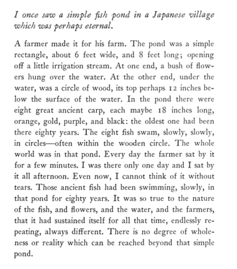 I love the form and the content. Alexander wrote the book so that it can be read in 5 minutes, 20 minutes or the full book in five hours.