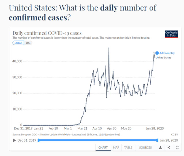 To put this in perspective, as a vulnerable I self-quarantined on March 13 when there were ~1,000 cases per day. Now we are in far worse shape as a country than we were in early March with >45,000 confirmed daily cases. That is not the worst of it. The CDC estimates that the U.S. total case count is 10 times higher than the 2.5 million confirmed cases so far. To make matters worse, the data on cases and deaths lags reality by at least 7 days due to the different ways that each state reports public health data.