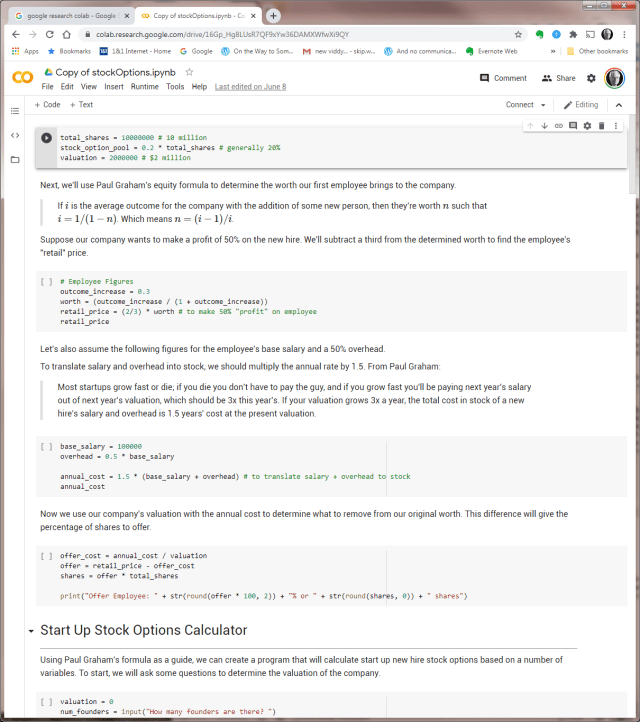 A formulaic way of figuring out how many stock options to give to one of the first 10 hires in a startup based on Paul Graham’s “Equity Equation” now appears on her screen: