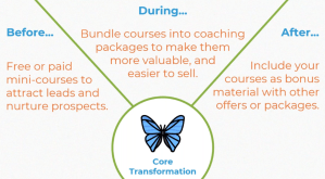 With a book and the online courses, the path to monetizing professional expertise is clear. By doing both the book and the course, they provide leads for private coaching, consulting engagements and for paid speaking opportunities. The courses and the consulting provide opportunities to recruit other professionals to be able to teach my core transformation material – for a royalty fee.