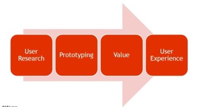 The first and most important is the user research which is primarily user observation. From the user observation, rapid prototypes are produced starting with low fidelity prototypes and then moving to higher fidelity prototypes. The third step in this process plays on the two meanings of value – monetizing the product and supporting human values. The last step is to improve the user experience of the product.