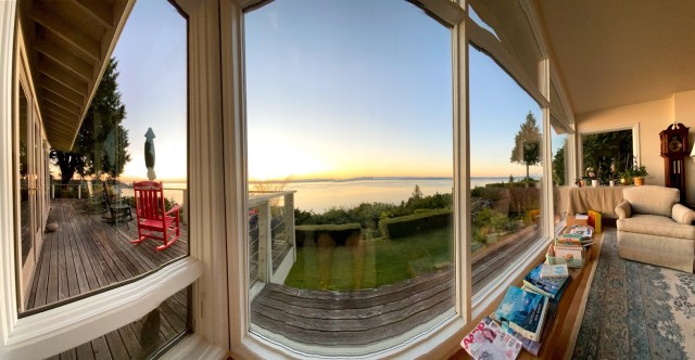 My chair sits in a wide Alcove that has a view of Puget Sound and Seattle and Mt. Rainier to the south. Yet, I can still see family and friends when they can gather on our deck (pre-pandemic).