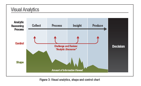 Attenex Patterns used visual analytics to increase the productivity of legal document review by at least ten times. The formal definition of visual analytics is the use of interactive information representations to shape and control an analytic reasoning process. Sean McNee summarizes the visual analytics process in this diagram: