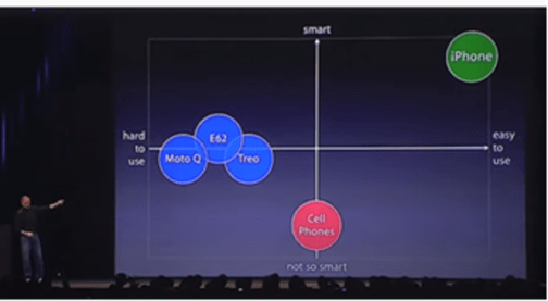 Steve Jobs did a masterful job of introducing the revolutionary iPhone as a continuing evolution of previous Apple products like the Mac and the iPod. He had an hour and a half to show the path of arriving at the iPhone, describing its innovative features, and along the way shared how much better it was than the competition of the many attempts to marry “smart” with “easy to use.” He illustrated in a simple 2×2 matrix how the iPhone was a leapfrog product: