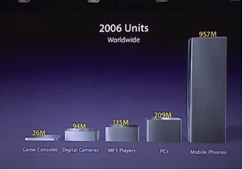 The Know Now example is a path to sharing a product vision with employees and customers. Steve Jobs at the end of the iPhone product launch provides an example of what investors need – some idea of the business potential of your product and vision. He showed a bar chart of the volume of units sold of different digital devices in 2006. The mobile phone makers sold 957 million units in 2006 dwarfing other digital devices.
