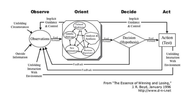 As I tweaked the above diagram, I wondered if there was a diagram that showed the feedback and feed forward loops or maybe a Venn diagram to illustrate relationships in a clearer way. As I doodled with different loops, I realized that I had not referenced the OODA Loop that John Boyd developed as a fighter pilot.